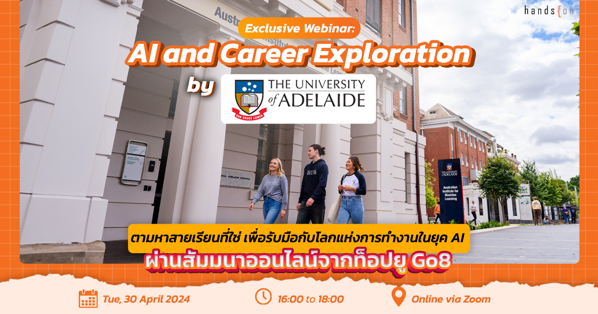 Hands On และ The University of Adelaide ได้ร่วมมือกันจัดกิจกรรมสัมมนาออนไลน์ เพื่อตอบโจทย์ความสนใจของน้อง ๆ ที่ต้องการเตรียมตัวศึกษาต่อในสาขาวิชา Artificial Intelligence (AI) ที่ประเทศออสเตรเลีย กับมหาวิทยาลัยชั้นนำ Group of Eight