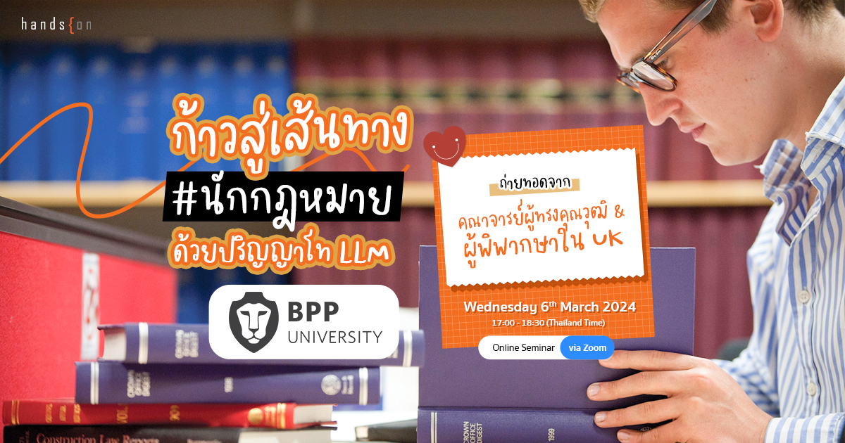 โอกาสดีสำหรับน้อง ๆ ที่สนใจเรียนต่อที่อังกฤษ โดยเฉพาะสาขากฎหมาย เมื่อพี่ ๆ Hands On ร่วมมือกับ BPP University มาเปิดสัมมนาสุดพิเศษ พร้อมเคล็ดลับการเตรียมตัวเรียนต่อที่อังกฤษ กับสัมมนาภายใต้หัวข้อ “ก้าวสู้เส้นทางนักกฎหมาย ด้วยปริญญาโท LLM จาก BPP University ถ่ายทอดจากคณาจารย์ผู้ทรงคุณวุฒิ & ผู้พิพากษาใน UK”